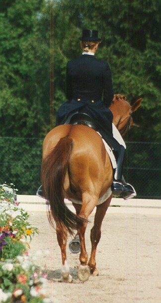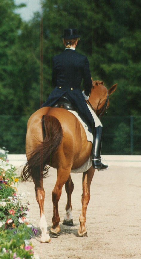 Das nebenstehende Foto zeigt gewiss kein schlechtes Schulterherein. Wichtig, dass der Betrachter von vorn oder hinten nur jeweils drei Beine sieht. In dieser Rückansicht deckt beim Schulterherein-rechts das rechte Hinterbein das linke Vorderbein. Auch gut, dass tatsächlich die Schulter des Fuchses ins Bahninnere geführt wird und nicht, wie man es leider oft vorfindet, lediglich die Hinterhand mit dem inneren Schenkel gegen die Bande gedrückt wird. So gerittene Pferde treten zwar über, Schulterherein ist es aber solange nicht, wie sich die Vorhand weiterhin - wie beim Geradeausreiten - auf dem Hufschlag befindet. |